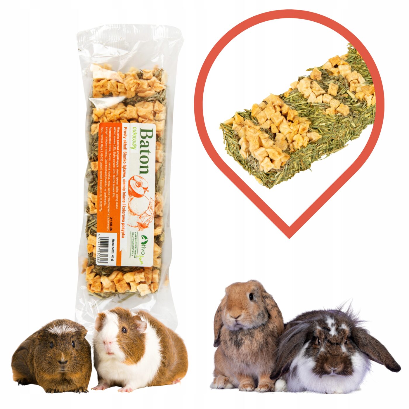 Batony 45g. Idealne do zabawy, jako przysmak, do pomocy w ścieraniu zębów. Zawierają dużą zawartość włókna, ponieważ bazą jest sprasowane sianko łąkowe z dodatkiem siemienia lnianego. Batony mają kolorowe posypki i występują w czterech smakach: bławatek i rumianek, nagietek i hibiskus, owocowy, warzywny.