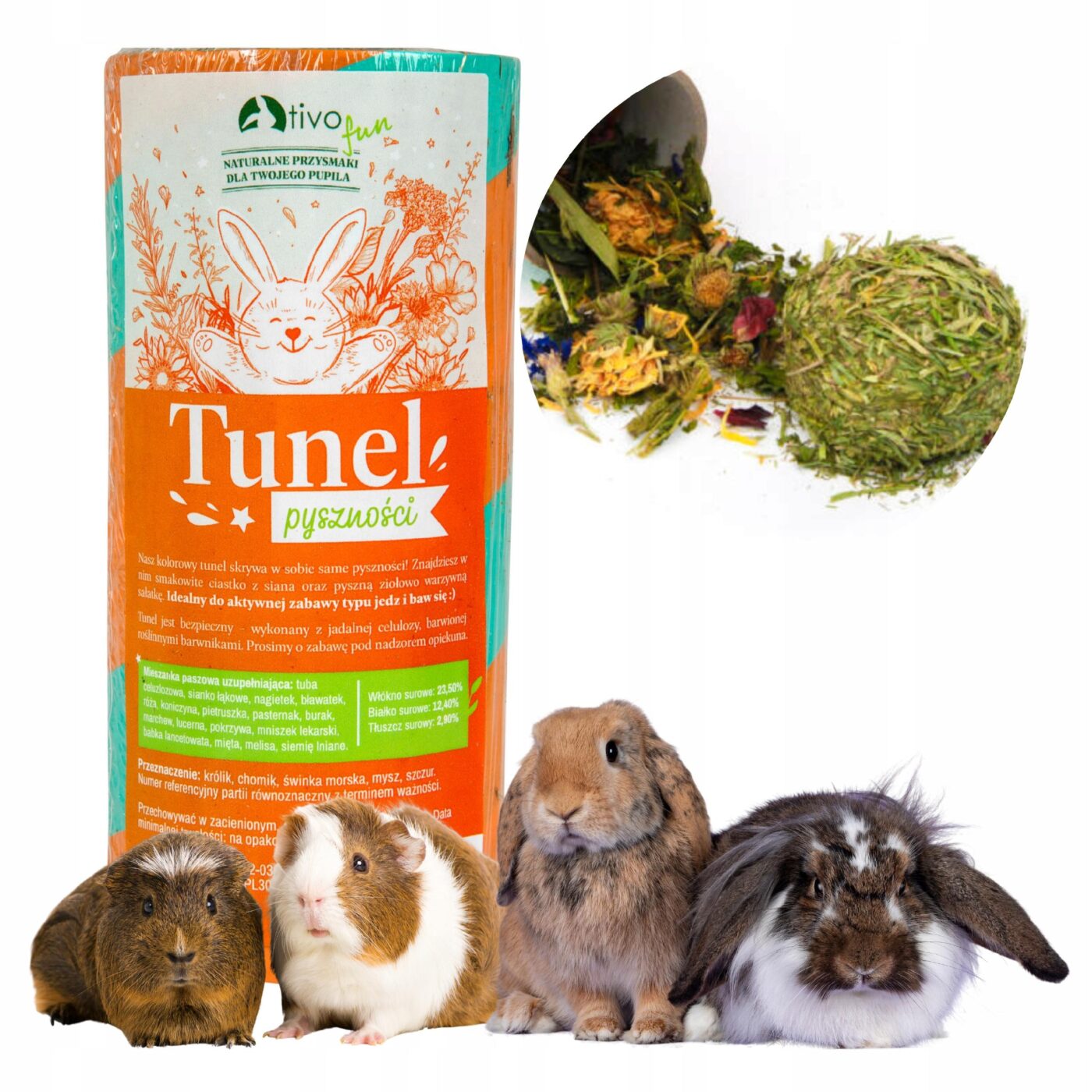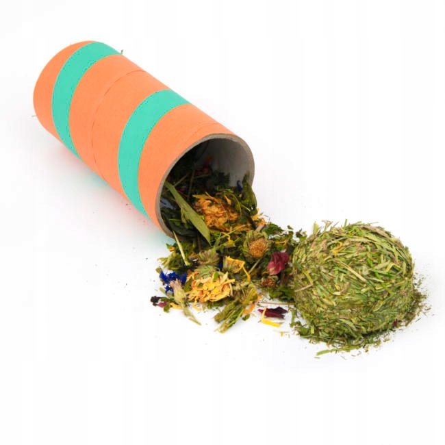 Skład: Tuba celuzlozowa, sianko łąkowe, nagietek, bławatek, róża, koniczyna, pietruszka, pasternak, burak, marchew, lucerna, pokrzywa, mniszek lekarski, babka lancetowata, mięta, melisa, siemię lniane